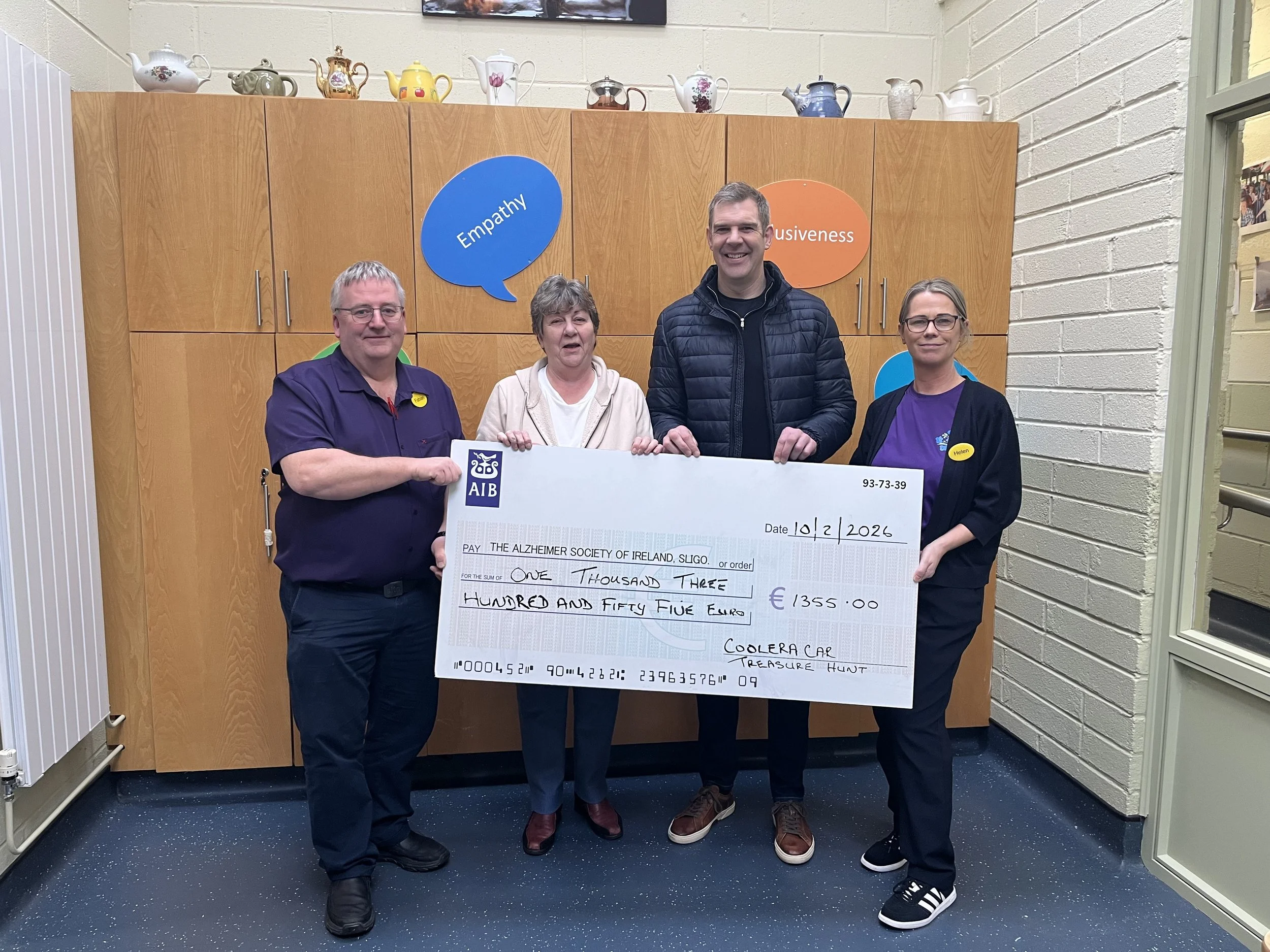 I got to visit the Aughamore Day Care Centre for the first time last week, to present a cheque to the Alzheimer’s Society of Ireland on behalf of the Coolera Car Treasure Hunt.